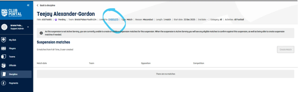 Suspensions related to individual charges are hyperlinked. As the charge is not for the club the hyperlink gives a 500 error. Removed the hyperlink on suspensions which are for individual charges (charge is direct to the individual).