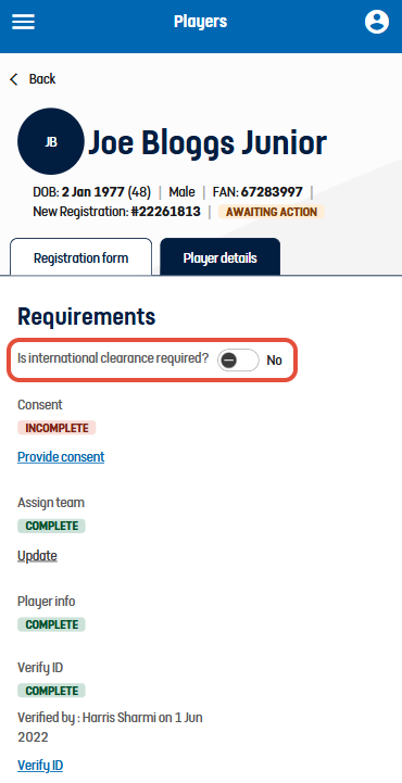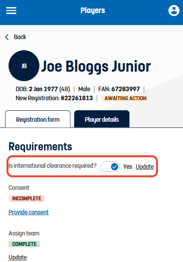 If the player requires international clearance, you will need to switch this to yes. This will bring up options to select the reason for international clearance and also details that is required to obtain international clearance.