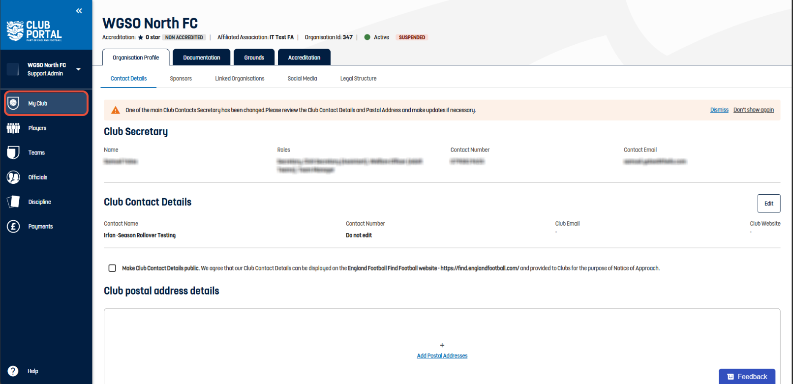 From this tab, you can update Club contact details which will be visible on England Football Find Football search engine, as well as information about sponsors, social media accounts, and your club's Legal Structure.
