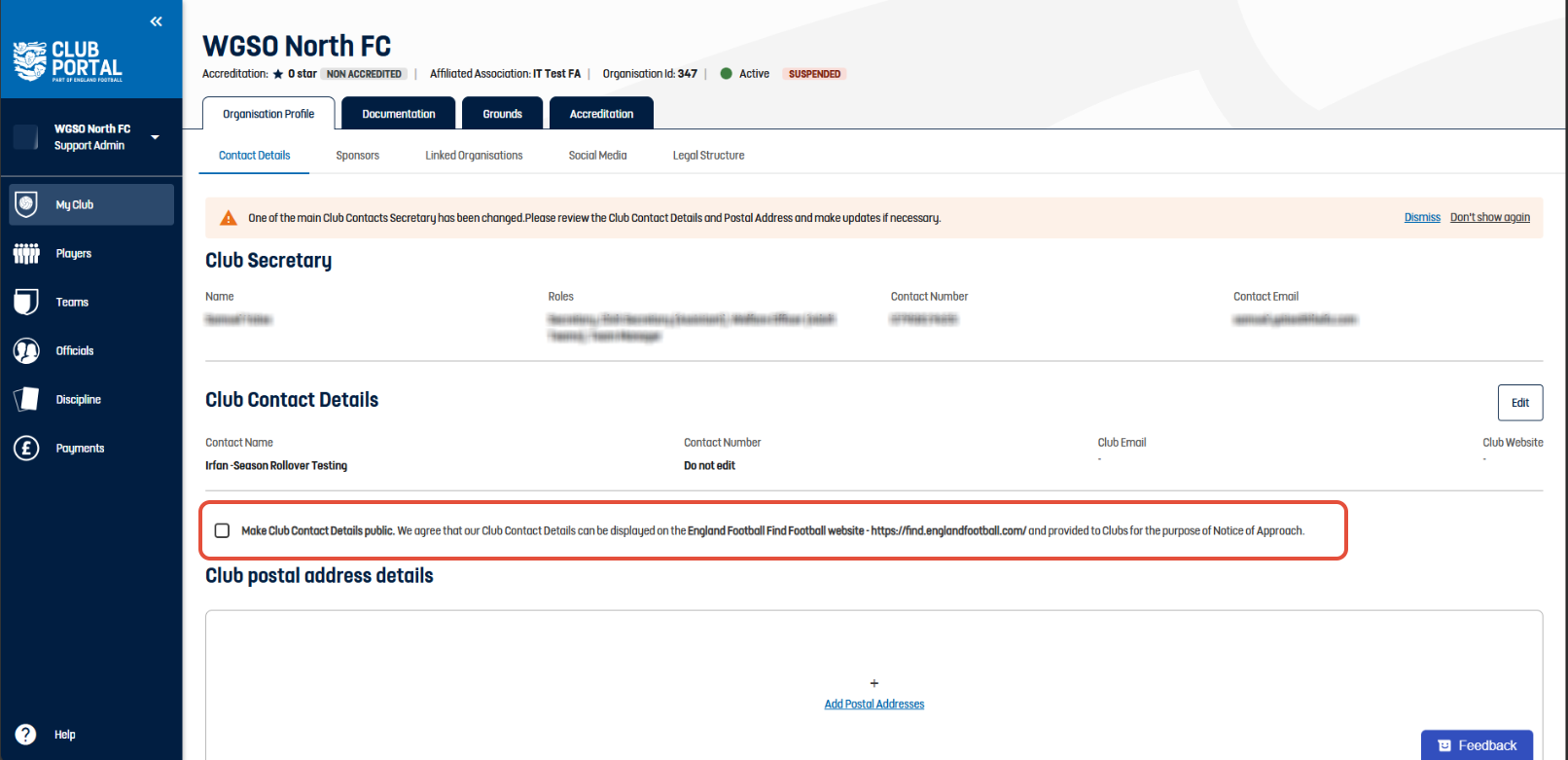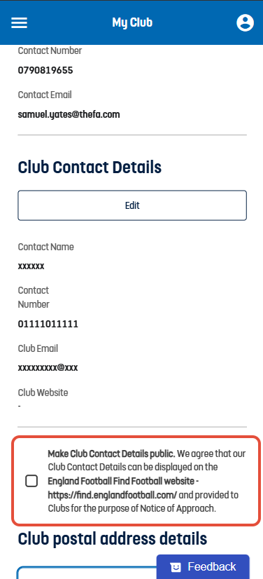 IMPORTANT: In order for Club contact details to be displayed publicly on the England Football Find Football search engine, you need to tick the box to agree to make the details public.