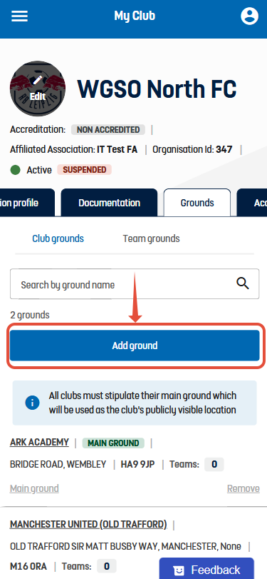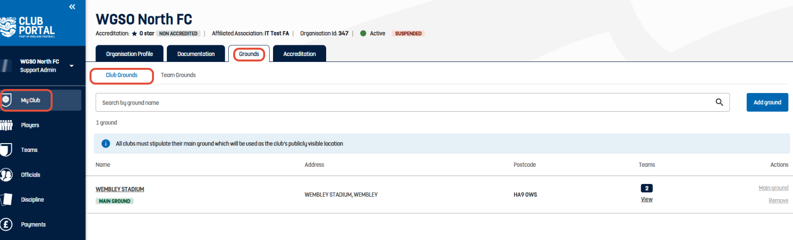 Please note: You cannot delete a main ground. To do this you will need to change your main ground firstTeam Grounds