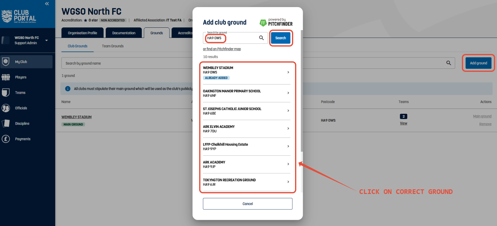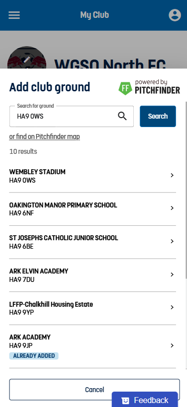 Step 2: Using pitch-finder, search for your grounds using postcode, place name or region. Select your ground and click confirm.