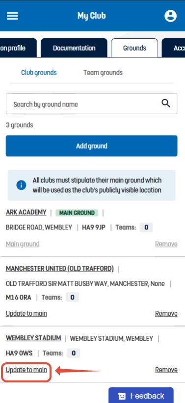 Step 3: To make this your clubs main ground, select the ground and click 'Update to main'