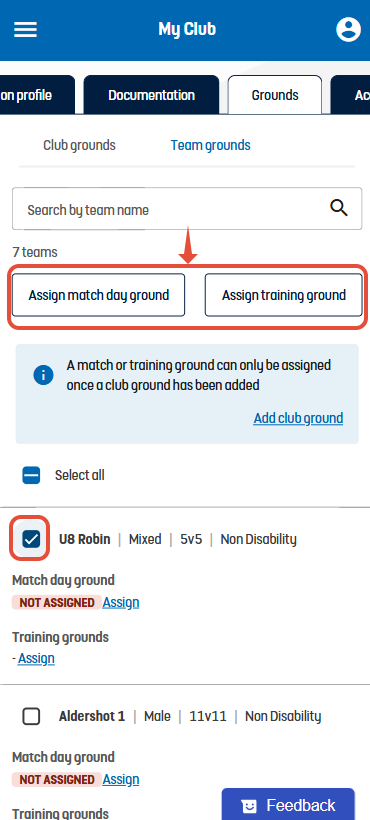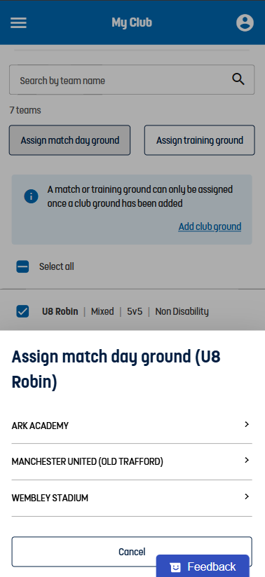 Step 2: Select the team you wish to assign a ground to and then select if the ground is a match day ground or a training ground.